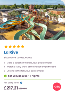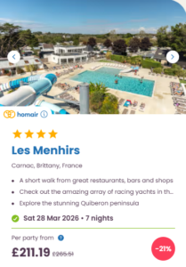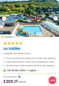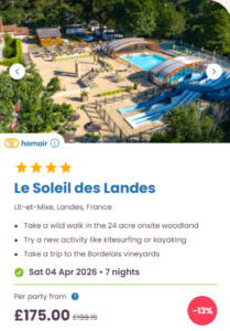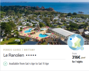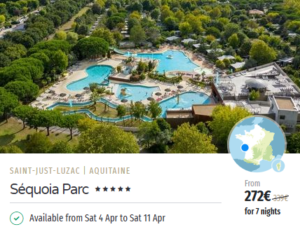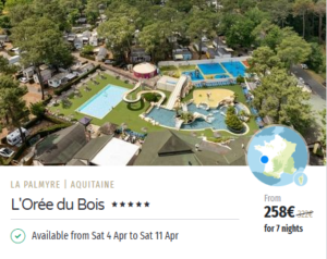 Quick note on pricing and seasonal facilities: these prices were live when I took the screenshots and they’re “from” prices, so they can jump around fast depending on accommodation type, availability, and how many people you’re booking for. And as Easter is still out of the “main” campsite season, make sure you check what facilities are available during your stay. It isn’t unusual for an outdoor pool to be closed, kids clubs reduced and restaurants running on limited hours, at this time of the year.